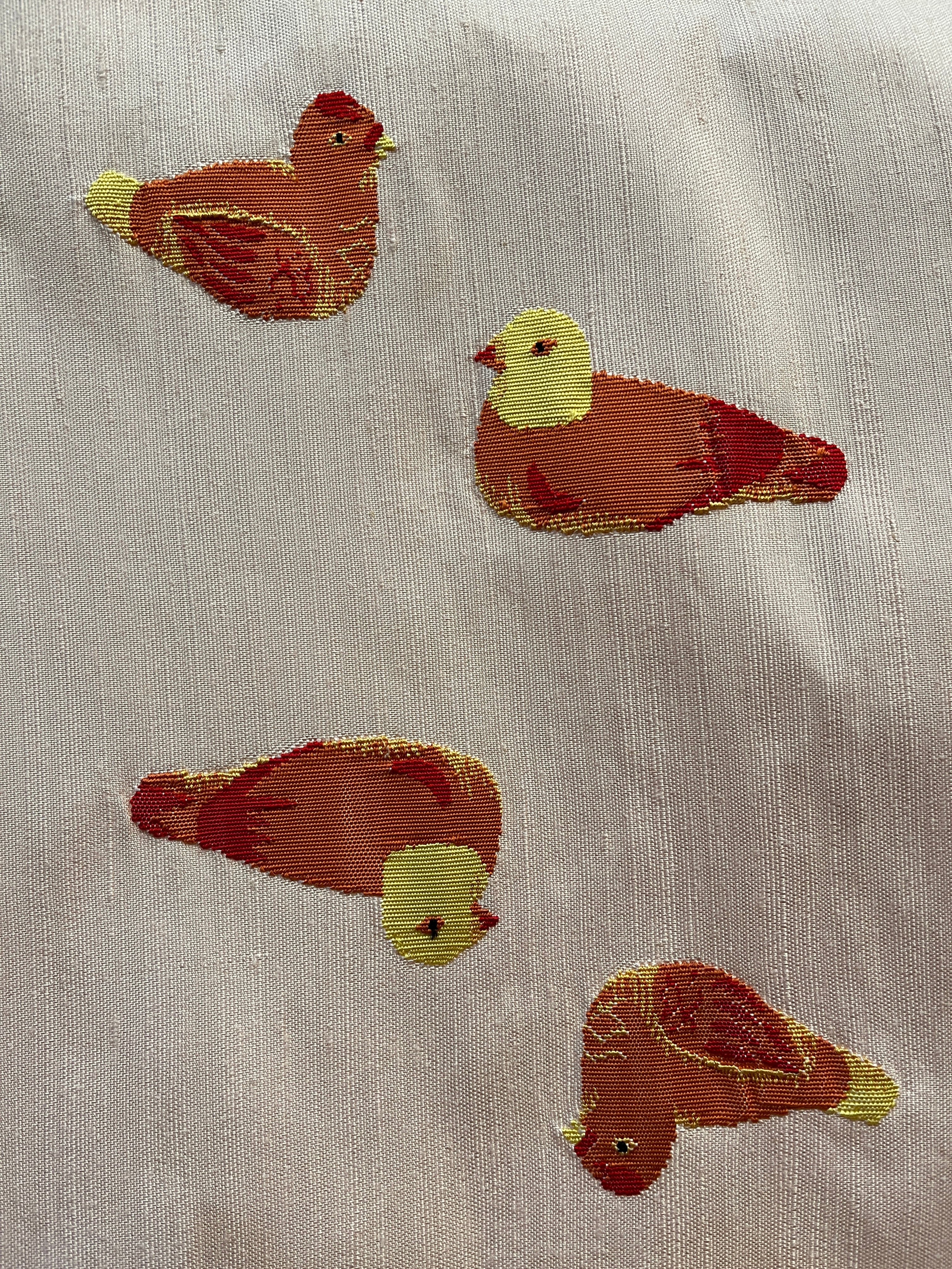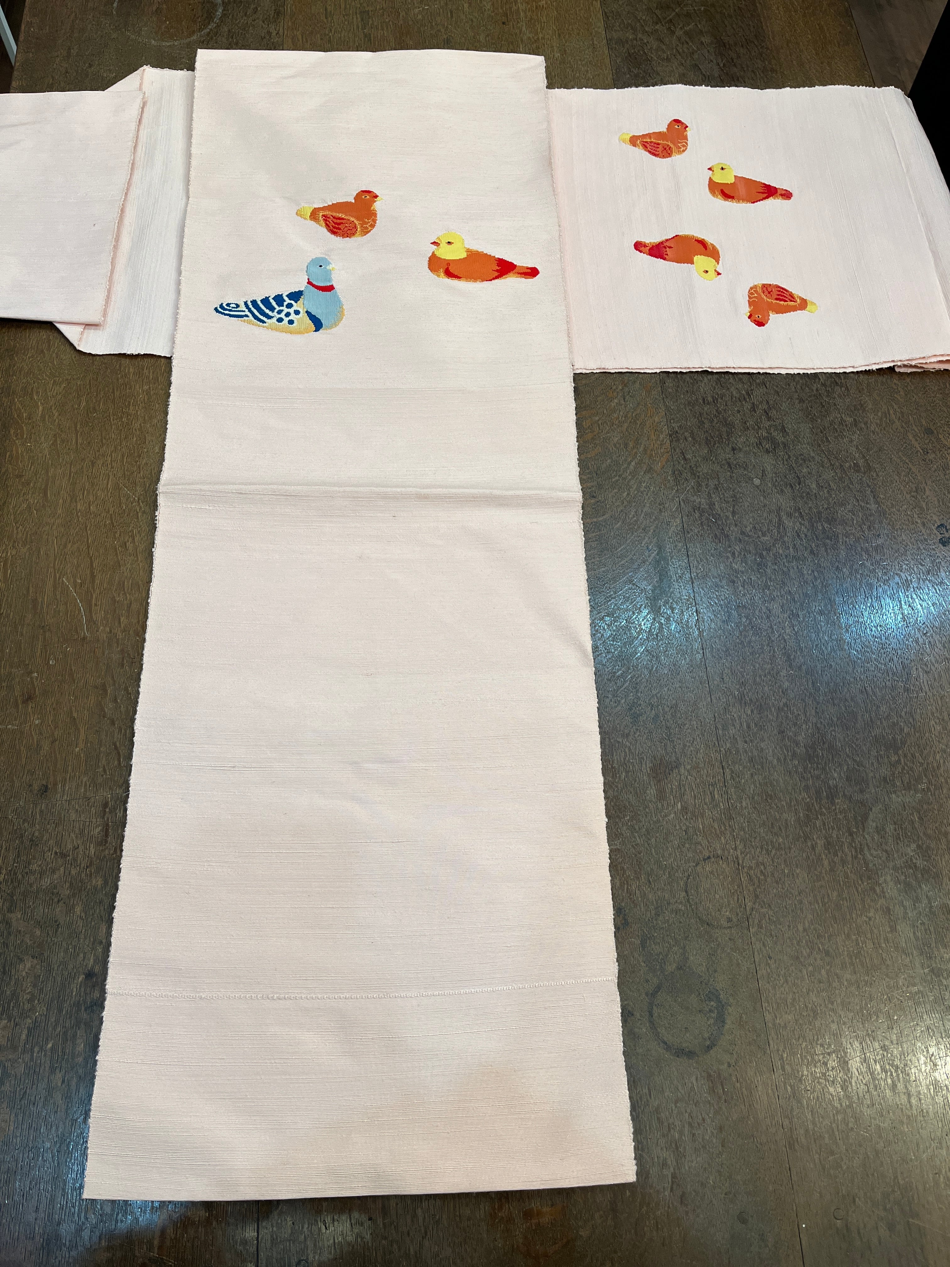絵本の挿絵のような、かわいらしい小鳥たちが特徴的なすくい織の洒落帯。