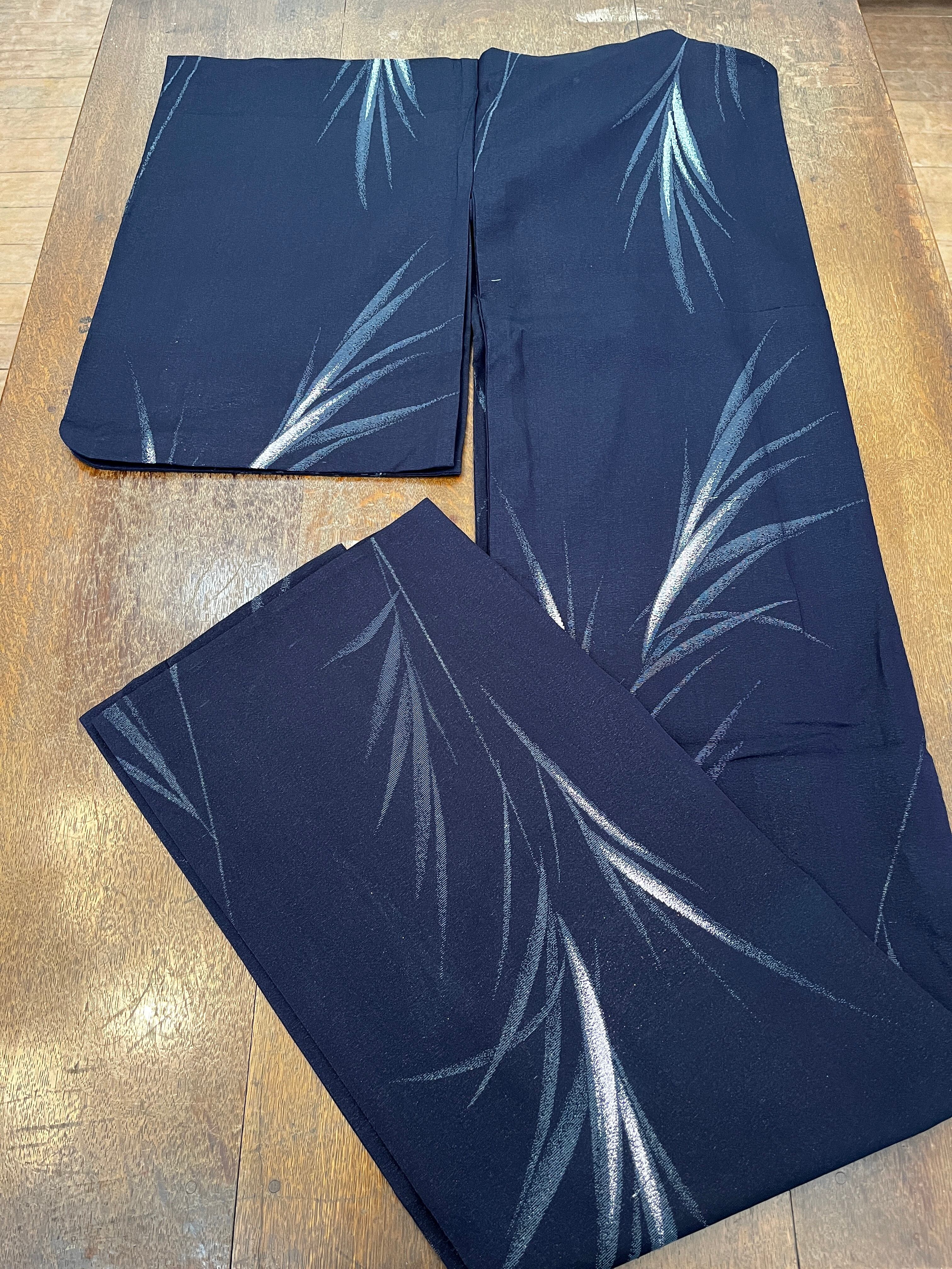 紺藍色の地に、銀糸で刺繍された夏草のすっきりとしたデザインが上品な印象を与えます。