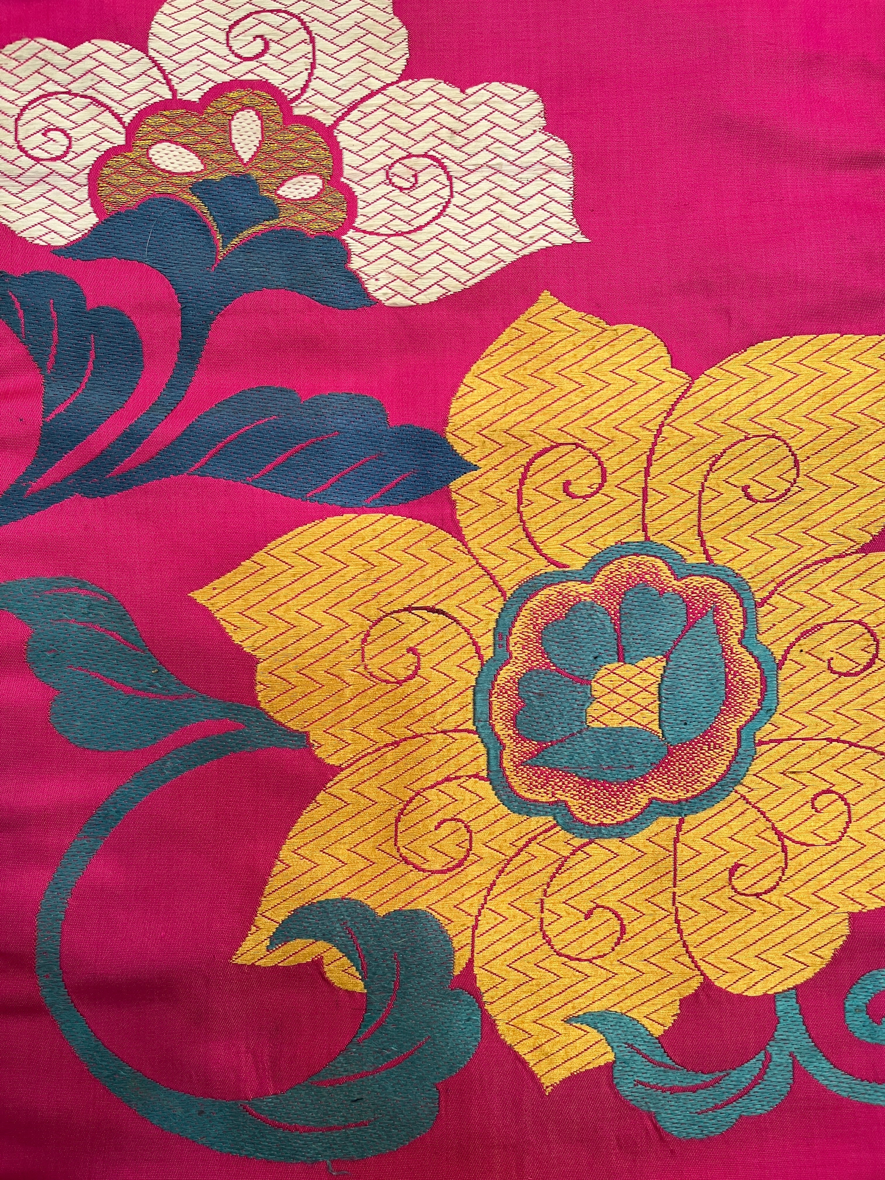 大柄の花唐草模様とマゼンダ色が目を引く華やかなアンティーク名古屋帯です。